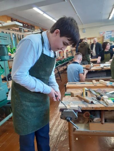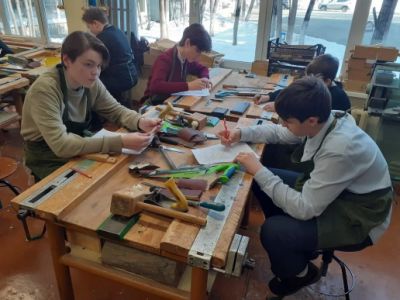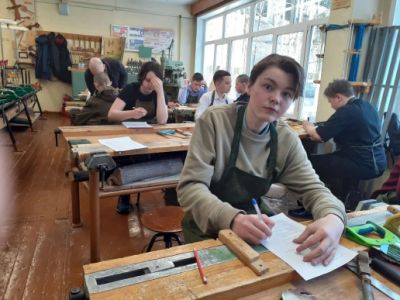 После инструктажа по технике безопасности учащиеся приступили к выполнению заданий: юные слесари с помощью слесарного инструмента изготавливали из листового металла вентиль для крана, а участники второй номинации конкурса, работая на столярных верстаках, изготавливали крестовину для флажка.