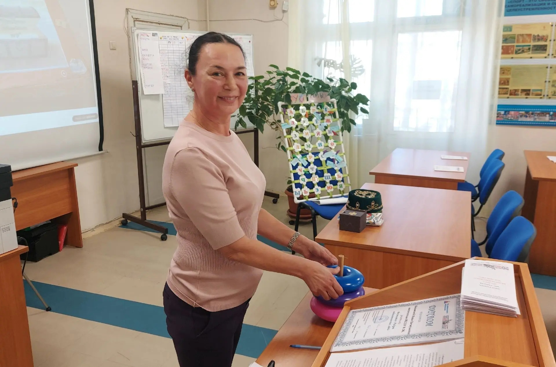 Пятое колечко: единство. 2026 год также объявлен Годом единства народов России по указу Президента В.В.Путина. Мы живём на Урале, который является многонациональным краем. Учитель-дефектолог МАДОУ № 25 Султанова Светлана Рифкатовна рассказала о коррекционно-воспитательном потенциале народных игр Южного Урала, поиграла с воспитателями и надела на стержень пирамидки последнее колечко.